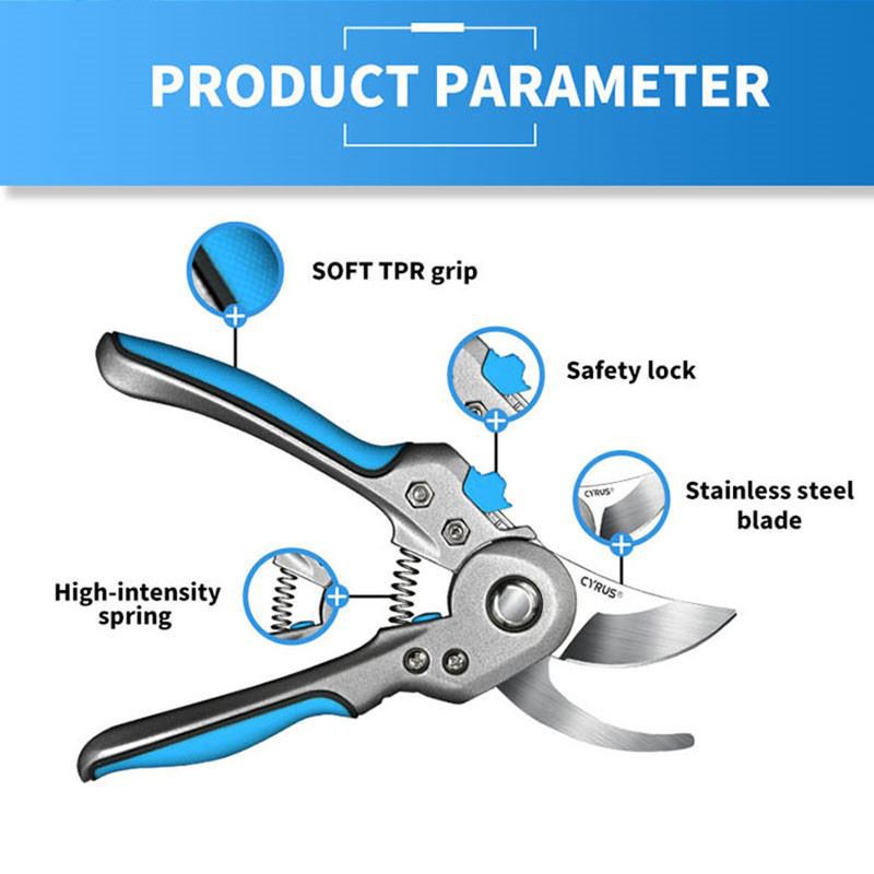 Máy cắt tỉa bằng thép không gỉ có Tay cầm TPR mềm, khóa an toàn, lưỡi dao bằng thép không gỉ và lò xo cường độ cao.